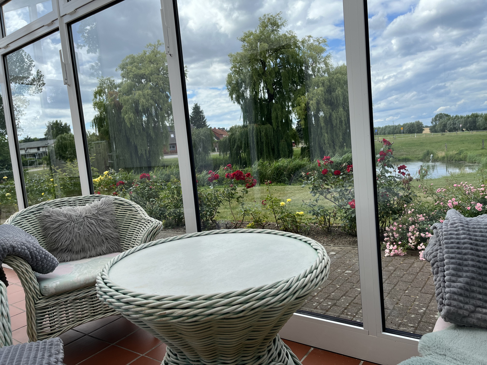 • Ein heller Wintergarten mit einem herrlichen Ausblick auf den Teich und die Pferdekoppeln,